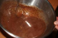 Do misky dáme vajcia, cukor, múku a kakao a nad parou miešame, pokiaľ zmes nezhustne. Necháme vychladnúť.