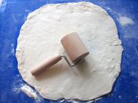 Lístkové cesto rozvaľkáme na pomúčenej doske do tvaru okrúhlej formy v ktorej budeme koláč piecť.