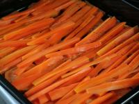 Zemiaky nakrájame na 5mm krúžky a poukladáme na vymastený plech. Mrkvu nakrájame na prúžky a poukladáme na zemiaky. Osolíme a jemne okoreníme mletou rascou.