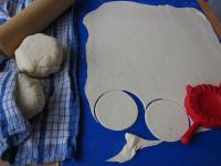 Bochník cesta vyvaľkáme natenko (2mm) na pomúčenej doske. Cesto je pevné, ale zároveň pružné a vláčne, dobre sa s ním pracuje. Pomocou formičky na pirohy vykrojíme kolieska. Kolieska môžeme vykrojiť aj väčším hrnčekom.