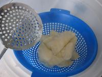 Jednu polovicu pripravených zemiakov (150g) vložíme do hlbokej nádoby, pridáme múku a vodu. Vymiesime tuhé, kompaktné cesto.