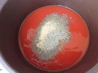 Do hustého paradajkového pretlaku pridáme vodu, soľ, bazalku, cesnakový prášok a mleté čierne korenie. Zamiešame.