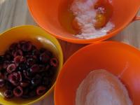 Čerešne umyjeme, rozpolíme a odkôstkujeme. Vajíčka rozbijeme a oddelíme žĺtka od bielkov. Z bielkov vyšľaháme tuhý sneh. Múku zmiešame s kypriacim práškom. Žĺtka vymiešame s cukrom. Primiešame pripravenú múku a sneh z bielkov.