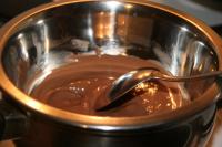Čokoládu na varenie roztopíme vo vodnom kúpeli. Odstavíme a necháme trochu vychladnúť. Do čokolády nič nepridávame, má byť hustejšia. TIP: Môžeme použiť akýkoľvek druh čokolády na varenie, my sme použili nugátovú.