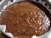 Čokoladové cesto nalejeme do formy s priemerom 28 cm vyloženej papierom na pečenie. Pečieme na 150°C 40 minút.