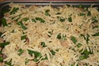 Na mäso, rovnomerne rozložíme mrazenú zelenú fazuľku (kto nemá rád fazuľku, môže použiť svoju obľúbenú zeleninu). Všetko zalejeme smotanou zmiešanou s pretlačeným cesnakom. Na záver nastrúhame polotvrdý syr.