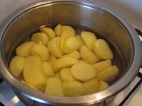 Zemiaky ošúpeme, umyjeme, pokrájame a zalejeme zarovno vodou. Pridáme soľ a uvaríme do mäkka. Polovicu vody zlejeme a v druhej polovici zemiaky pomačkáme.