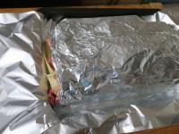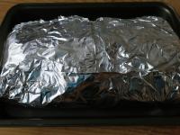 Na dosku položíme dvojmo alobal o veľkosti cca 50 x 45 cm. Alobal nahrubo natrieme masťou.