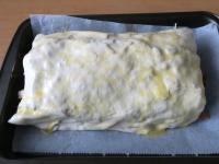 Po vychladení položíme roládu na rozvinuté lístkové cesto, zabalíme a preložíme na pekáč, aj s papierom na pečenie, v ktorom bolo lístkové cesto stočené. Potrieme rozšľahaným vajíčkom.