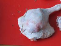 Stehná umyjeme a osolíme. Na stehnách z vrchnej časti oddelíme kožu od mäsa a vytvoríme kapsičky.