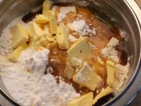 K múke pridáme nakrájané maslo, cukor a vajce.
