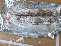 Kokosovo-datľový plát prekrojíme po dĺžke na polovicu a pomocou alobalu stočíme dve rolády. Vložíme na hodinu do mrazničky.