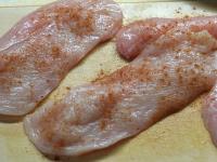 Kuracie prsia nakrájame na tenšie rezne (aby sa dali ľahko zavinúť). Okoreníme mletou červenou paprikou, jemne osolíme.