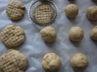 Guľôčky poukladáme na plech vystlaný papierom na pečenie v primeraných odstupoch. Každú guľôčku dlaňou sploštíme a na povrchu vytvoríme mriežku.
