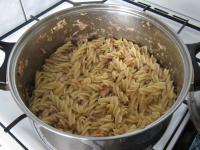 Cestoviny uvaríme v slanej vode. Precedíme a vrátime ich späť do hrnca.