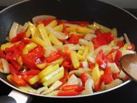 Papriku vyčistíme, umyjeme a pokrájame na prúžky. Pridáme k zemiakom s cibuľou a minútku orestujeme.