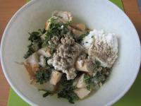 rožok biely 120 gramov • mlieko polotučné 1,5% 50 mililitrov • vajce slepačie 3 kusy • syr cottage cheese 150 gramov • petržlenová vňať 25 gramov • soľ ½ čajovej lyžičky • korenie čierne mleté ½ čajovej lyžičky