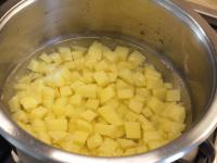 Zemiaky očistíme, nakrájame na menšie kocky a dáme variť do slanej vody. Uvaríme do mäkka cca 15-20 minút.