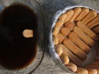 Vodu zmiešame s instantnou kávou a rumom a nalejeme ju do plytkej misky. Do druhej misky si pripravíme mlieko. Do mlieka postupne namočíme piškóty ktoré máme uložené po obvode formy. Piškóty nemáčame dlho, aby sa nám moc nerozmočili.