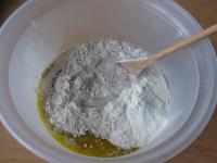 Do 150 ml teplého mlieka (z odmeraného množstva) rozdrobíme droždie, pridáme trochu cukru a necháme vzísť kvások. Do misy nasypeme múky, pridáme cukor, vajce, olej, štipku soli a prilejeme zvyšné mlieko a kvások.