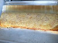 Preložíme na plech a papier zvrchu koláča zložíme na plech (môžeme aj odstrihnúť, odrezať). Okraje koláča pozatláčame, celý natrieme vajíčkom a popicháme vidličkou.