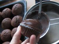 Po upečení necháme mafiny vychladnúť a vyberieme ich z foriem. Vo vodnom kúpeli rozpustíme čokoládu. Vršky mafinov do nej namočíme...