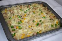Recept na zapekané cestoviny s kuracím mäsom na hrášku a kukurici.