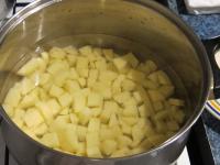 Zemiaky očistíme a nakrájame na malé kocky. Uvaríme ich vo vode spolu s bobkovým listom a soľou.